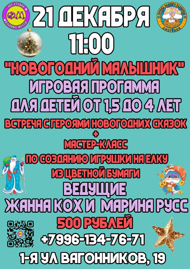 Мы уверены, что это станет не только увлекательным занятием для вашего ребенка, но и прекрасной возможностью для мам пообщаться и обменяться впечатлениями. Подарите своему малышу настоящий новогодний праздник! Не упустите шанс наполнить этот день удивительными эмоциями и яркими впечатлениями. Ждем вас с нетерпением!