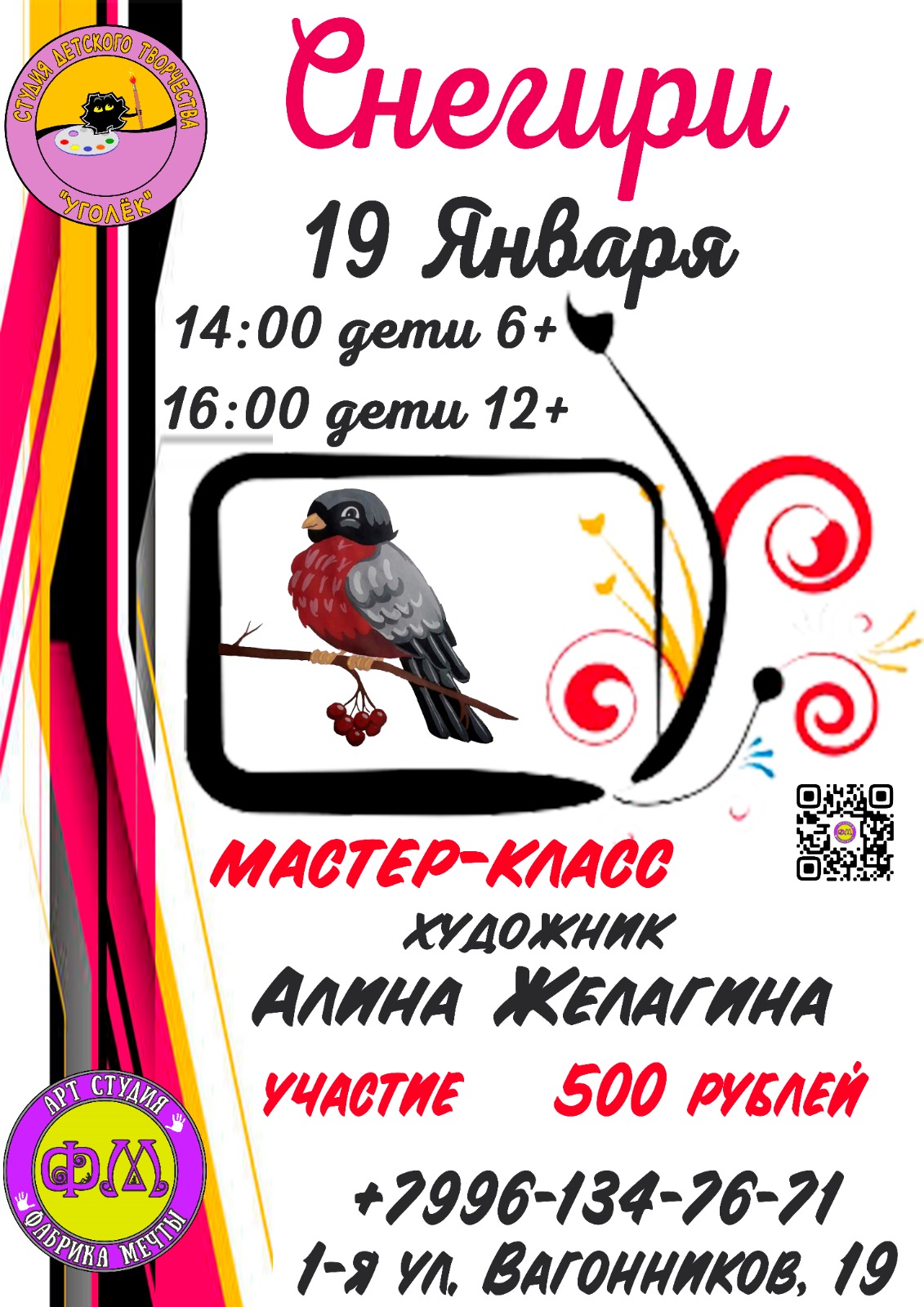Мастер-класс «Снегири» в студии детского творчества «Уголёк»Дата: 19 января в 14.00 и в 16.00Что вас ждёт:Нарисуете знаменитую зимнюю птицу — снегиря.Узнаете новые техники быстрого и точного рисования.Проведёте время с пользой и удовольствием.Кто ведёт мастер-класс:Алина Андреевна Желагина — руководитель студии, выпускница ТВГу по специальности «Педагогическое образование, профиль изобразительное искусство». Алина Андреевна участвовала в выставках, занималась реставрацией и оформлением стен. Она предпочитает акварель, гуашь, пастель и уголь. Сейчас учится в магистратуре, участвует в конференциях и конкурсах.О студии «Уголёк»:В студии дети занимаются рисованием, лепкой, аппликацией и оригами. Это помогает развивать творческие способности, воображение и мелкую моторику.Приходите, если хотите:Научиться рисовать.Развить творческие способности.Провести время с пользой.Записаться на мастер-класс можно по телефону: 89961347671Ждём вас в студии детского творчества «Уголёк»!